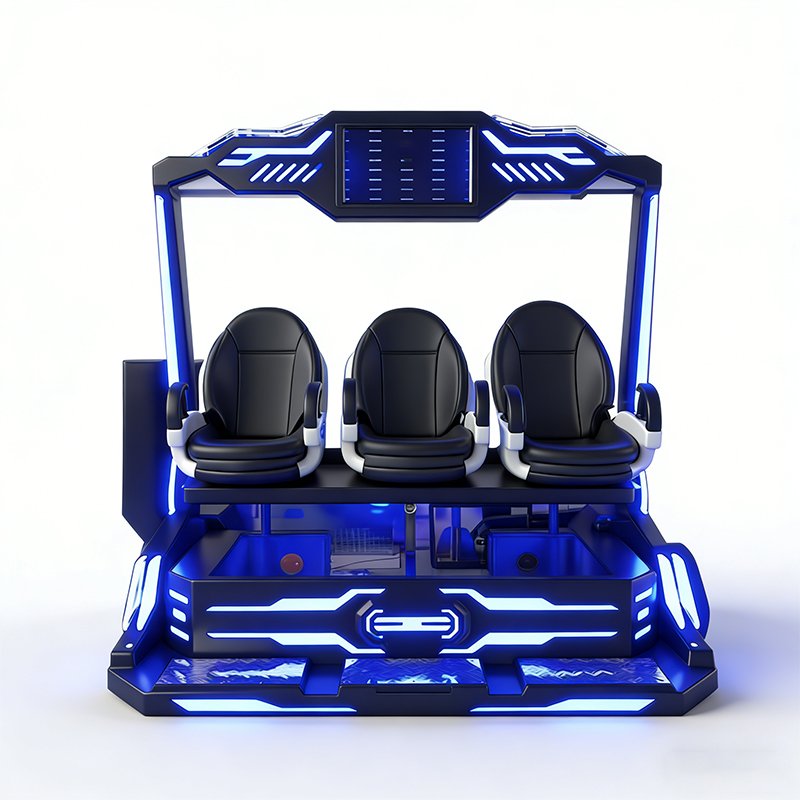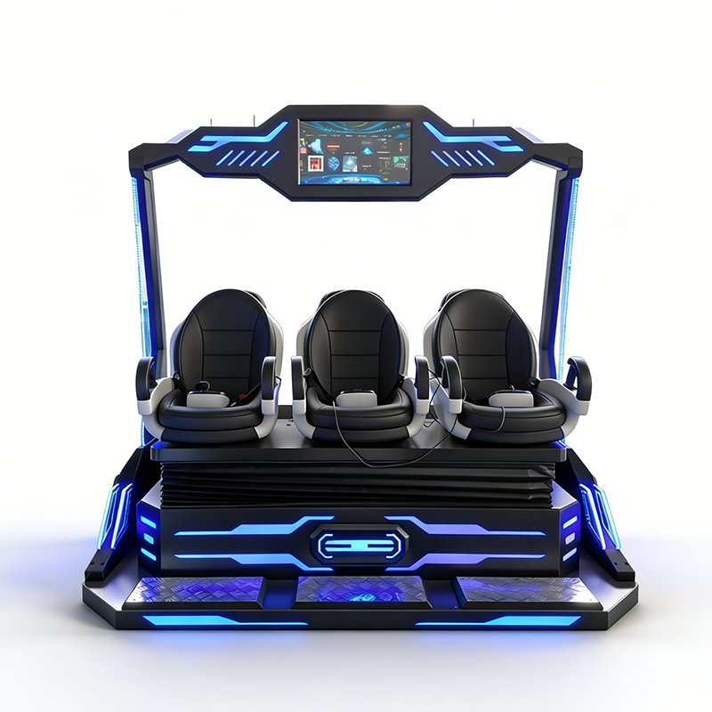 The 3 Player 9D VR Chair Simulator is a next-generation immersive entertainment system designed for commercial VR experiences. It combines advanced motion simulation technology with high-definition virtual reality to deliver a highly realistic and engaging gameplay environment.